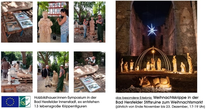 Anfang Juli 2022 organisierte die Stadt Bad Hersfeld einen Event der besonderen Art. Holzbildhauer:innen arbeiten eine Woche lang Holzkunst-Workshop in der Hersfelder Innenstadt. Aus großen Eichenstämmen entstanden 13 lebensgroße Krippenfiguren.